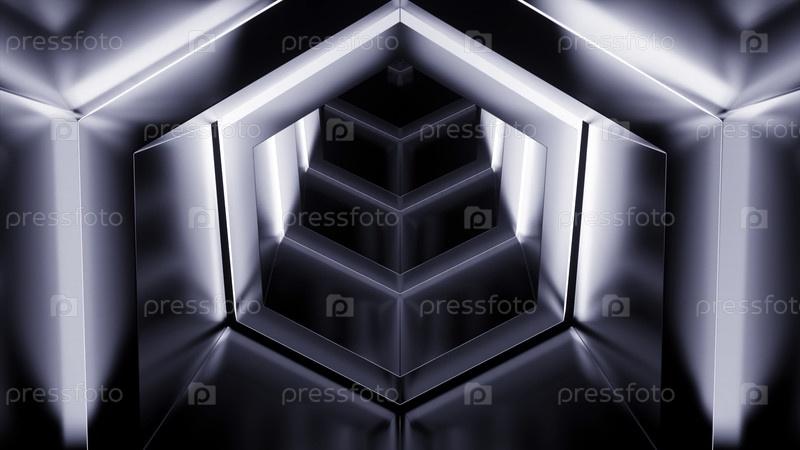 Абстрактные монохромные шестиугольные формы, создающие эффект туннеля.Дизайн.Летание через неоновые рамы