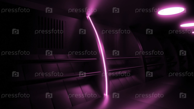 Тёмный 3D-туннель с неоновыми огнями. Дизайн. Движение в футуристическом темном коридоре. Технологический коридор с металлическими стенами и неонными лампами