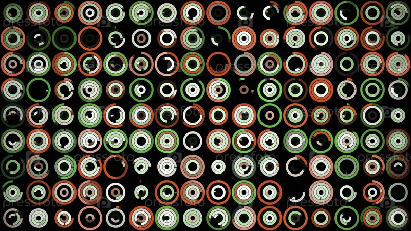 Много маленьких многоцветных кругов, вращающихся на черном фоне в разной последовательности