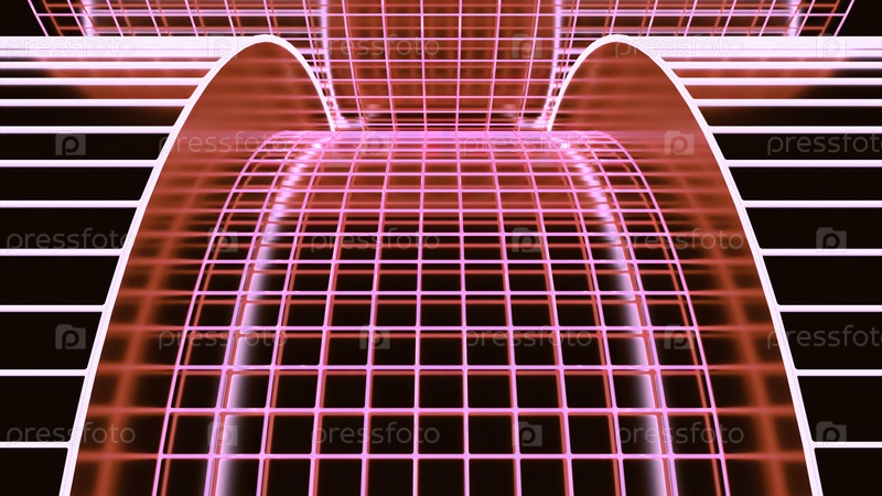 Перемещение кибердороги с сеткой. Дизайн. Виртуальная кибертрасса из нейлоновой сетки. Киберпанковая дорога в виртуальном пространстве. Передвижение гоночных горшков из киберсети