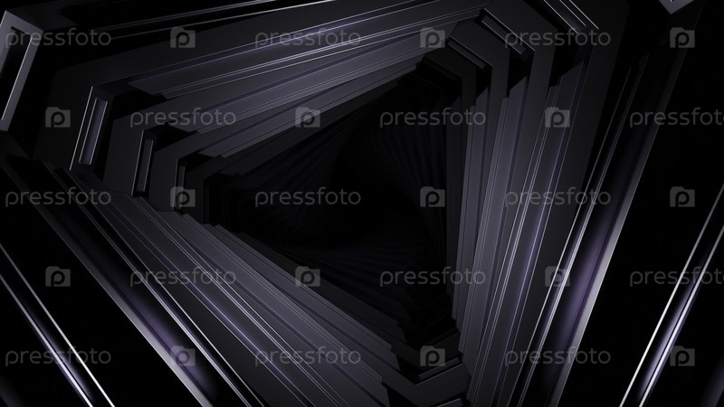 Треугольный 3D-туннель. Дизайн. Движущийся треугольный туннель с темнотой. 3d-тунел с металлическими треугольными стенами на фоне тьмы