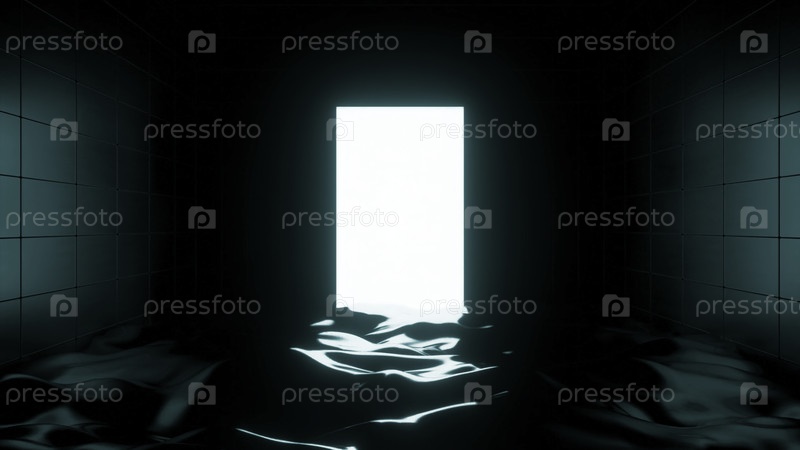 3D комната с жидкостью и дверью. Дизайн. Яркая светящаяся дверь с темной комнатой, заполненной жидкостью. Темная 3d комната с жидким и светящимся выходом
