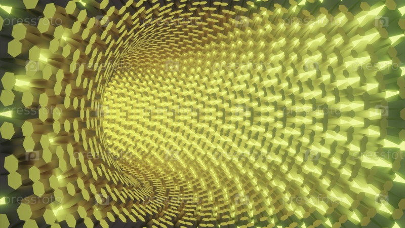 Быстро движущийся туннель в киберпространстве. Дизайн. Виртуальный неонный тоннель быстро движется. Светящийся тоннель перемещается в виртуальное пространство