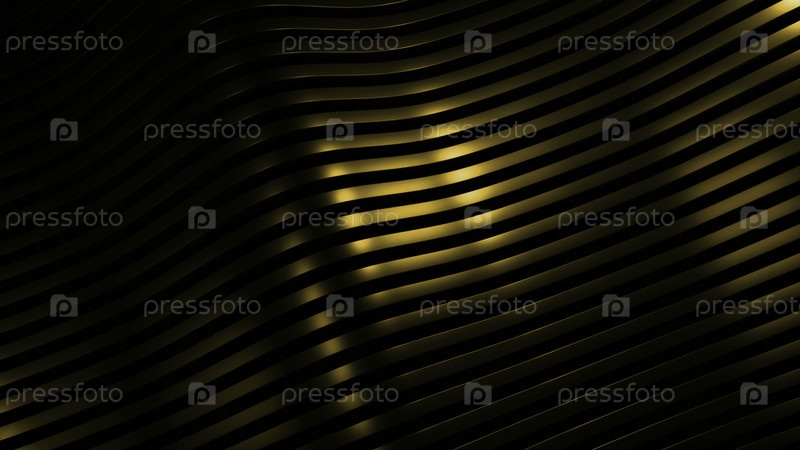 3D-фон с движущимися волнами полос. Дизайн. Металлические ленты перемещаются волнами на черном фоне. Шелковистые линии с металлическим блеском передвигаются в 3d-волнах
