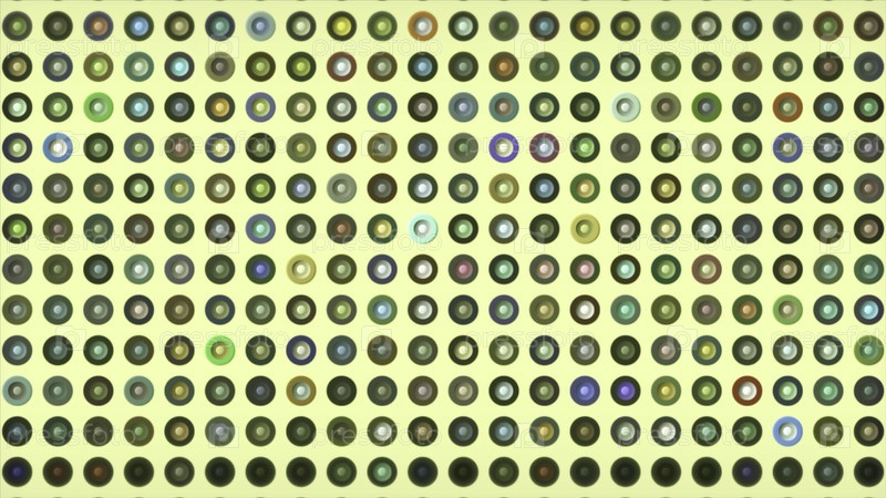 Много мигающих точек разных цветов. Движение. Диско-точки, мигающие различными цветами. Красочные точки мозаики с кольцами на твердом фоне
