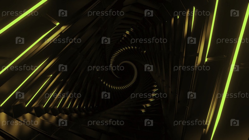 Движение в спирали со структурой и неоновыми полосками. Дизайн. Футуристическая 3D-спираль с неонными полосками. Темная спиралка в стиле космического корабля с поворотом