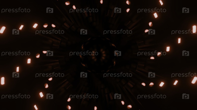 Светящиеся точки вращаются в спирали на темном фоне. Дизайн. Технологическая спираль с вращающимися неоновыми точками во тьме. Неонные фонари движутся в спиралах во тьме