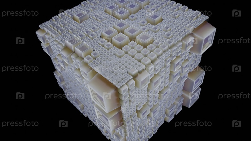 3D-куб с выпуклыми квадратами вращается на черном фоне Futuristic cube design with square 3d bulges