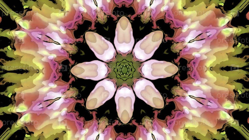 Абстрактный калейдоскопический фон, уникальная мандала в форме звезды или цветка. Движение. Концепция медитации и благополучия
