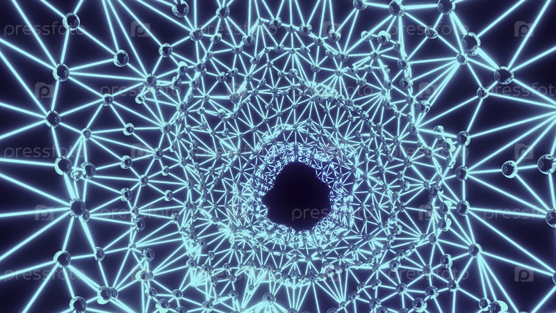 Растущая структура сплетения из серебряных сфер и оранжевых соединенных линий на темно-синем фоне