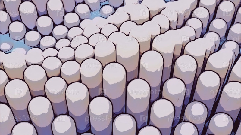 Абстрактная розовая детская игрушечная визуализация с столбами, перемещающимися через круглые отверстия. Дизайн. Длинные скользящие объекты
