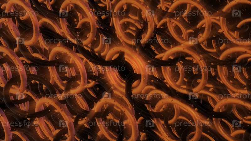 Ряд красных сферических цепных колец, бесшовная петля. Дизайн. Вид сверху многих соединенных колец светящихся и вращающихся