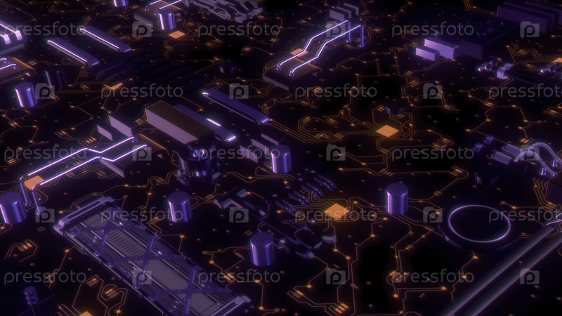 Компьютерная система с неоновыми деталями. Движение. Футуристическая компьютерная технология в деталях чипа. Неонные линии детали компьютерного чипа или материнской платы