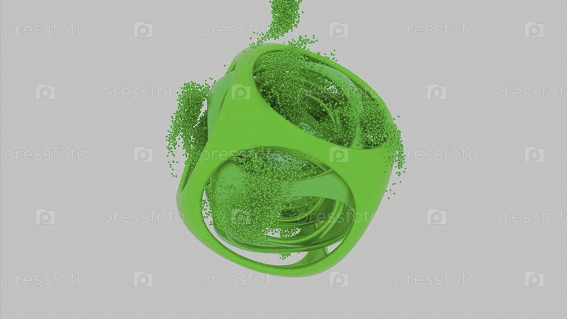 Абстрактная зеленая сложная геометрическая фигура со многими слоями внутри, вращающаяся на белом фоне. Дизайн. Частицы, улетающие от объекта кубической формы