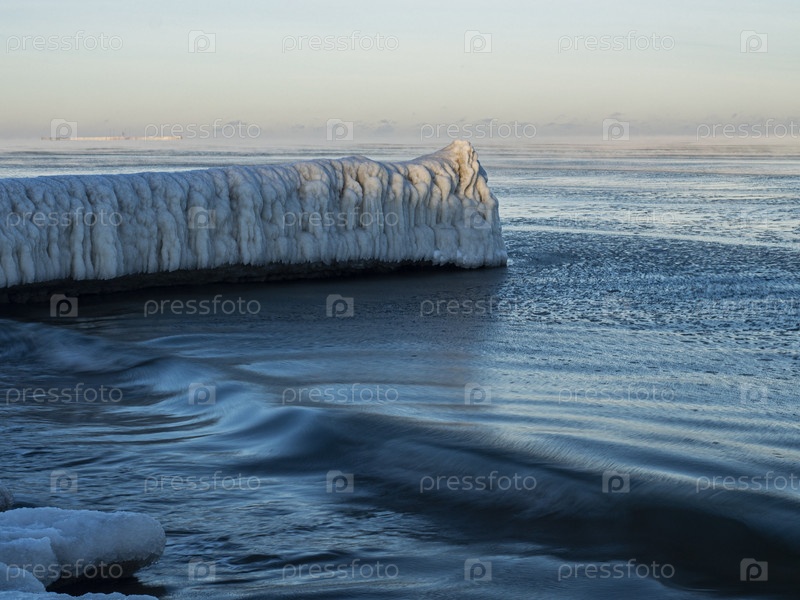 Обледневший волнорез и волна