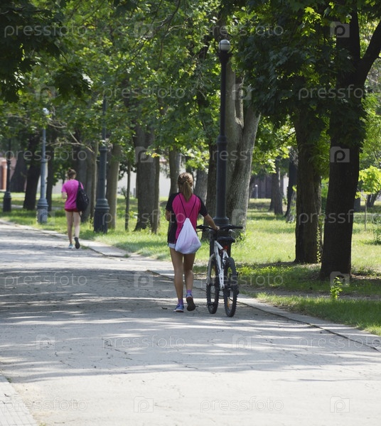 Красивая девушка идет по тропинке в парке и качает велосипед рядом с ней