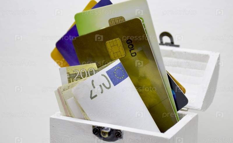 Открытый белый деревянный сундук заполнен кредитными картами различных цветов (золото, зеленый, фиолетовый, желтый) и евробанкнотами