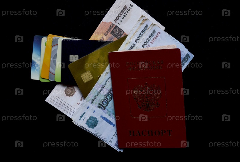 Паспорт российского гражданина, рубли и банковские карты на черном фоне. борьба с коррупцией и взятками. сумма за покупку, налог, кредит или после продажи товара