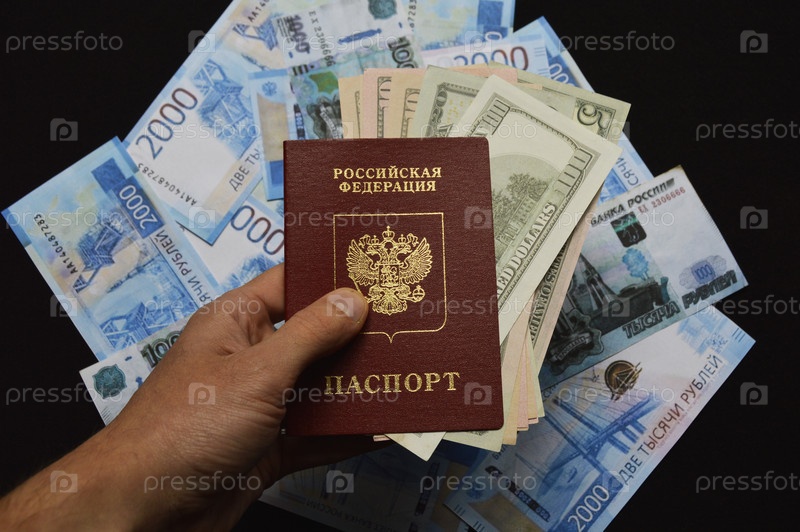 Российский паспорт и инвестированные доллары в руке человека на фоне рублей. путешествие за границу во время отпуска или каникул. борьба с коррупцией и взяточничеством. экономические санкции и кризис