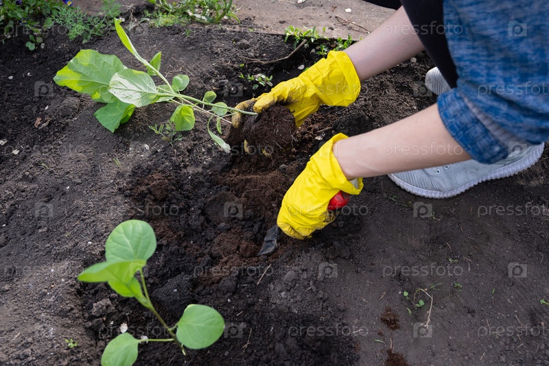 Саженцы баклажанов сажают руками в почву в саду