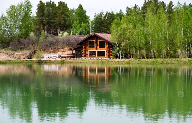 Деревянный дом стоит на берегу тихого озера, окруженного зелеными деревьями.В воде видны четкие отражения дома и пейзажа.Сегодня день и светит солнце