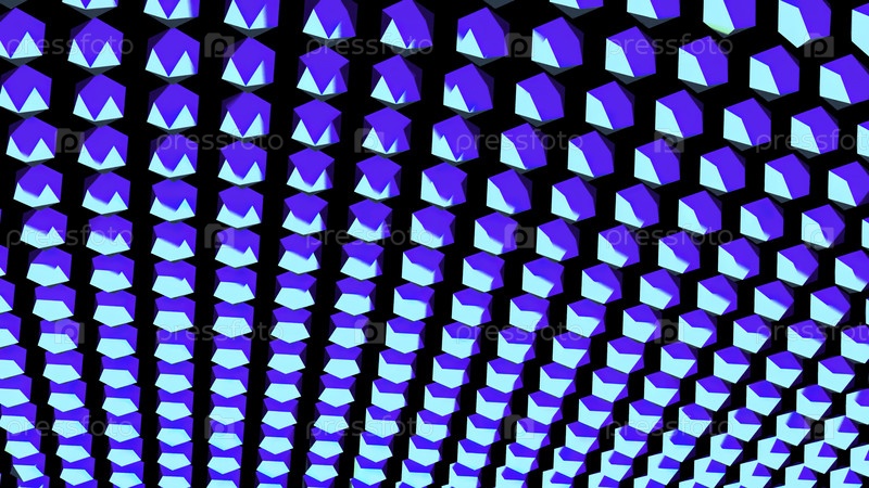 Игра света и теней на рядах 3D фигур синего цвета. Дизайн. Зернистая текстура вращающихся форм, бесшовная петля