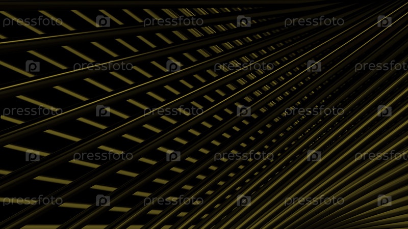 Скрещенные абстрактные золотистые металлические 3D полосы, текущие на черном фоне.Движение.Оптическая иллюзия с металлорешетчатым материалом