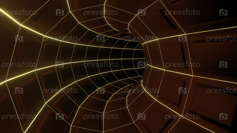 Скорость цифровых огней, светящихся неонными лучами в движении в цифровом технологическом туннеле. Дизайн. 3D эффект полета внутри красного тоннеля