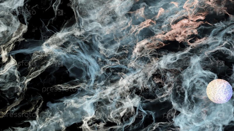 Полет в космосе через звезды и газовое облако с космическими туманностями.Дизайн.Абстрактный научный фон с облаками и неизвестной планетой