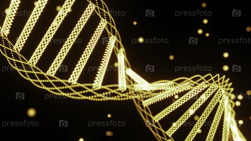 Дизайн. Красивая вращающаяся спираль ДНК с волшебными точками. Светящиеся точки передвигаются вокруг спирали ДНК