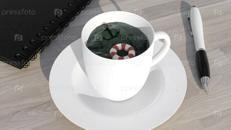 Белая кружка, стоящая на рабочем столе. Дизайн. Интересный натюрморт сделан в анимации, где вода наливается в кружку, красная спасательная линия и черное якорь