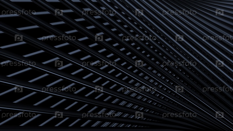Абстрактный промышленный фон с изогнутой металлической сеткой. Движение. Синяя перекрещенная железная или металлическая трубка, похожая на полосы