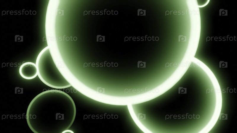 Неонные 3D шары движутся спирально в пространстве. Дизайн. Светящиеся кольца с формой 3d шара на черном фоне. Светящие шарики двигаются в головокружительном спиральном потоке в космосе