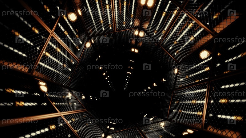 Пролететь через зеркальный туннель с технологическим рисунком. Дизайн. 3D коридор со светящимися огнями
