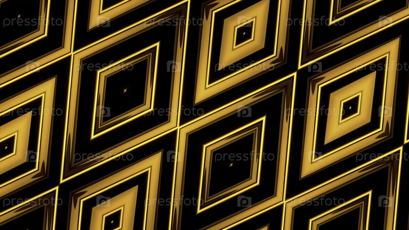 Калейдоскопические формы золотистого цвета. Движение. Цветный фрактальный рисунок ромба на черном фоне