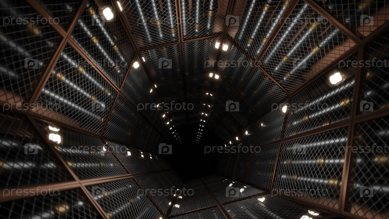 Темный туннель с оранжевым освещением.Дизайн.Светлый тоннель со светом в анимации, который медленно движется вниз