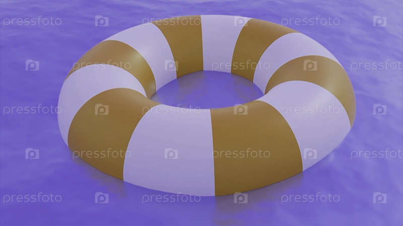 Специальное спасательное оборудование в многоцветном море.Дизайн.Белая полосатая бухта спасения, плавающая на волнах яркого моря сделанная в мультфильме