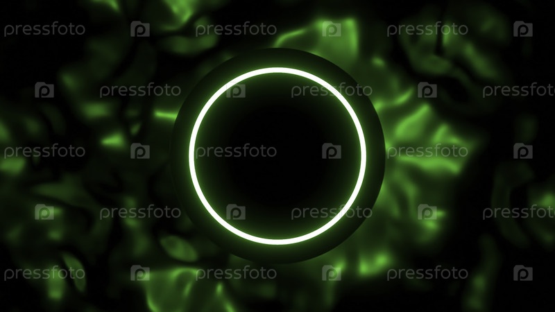 Черная дыра с неоновым кругом на жидком фоне. Дизайн. Абстрактная анимация с круглым и неоновым кольцом на фоне движущейся жидкости. Черный круг и неоновое кольцо на фоне движущейся жидкой текстуры