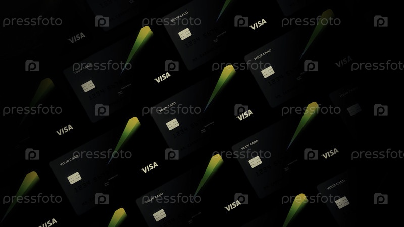Abstract Кредитные карты VISA, инвестиционная концепция. Движение. Ряд новых стилизованных кредитных или дебетовых серых карт с зеленым лучом, движущихся на темном фоне