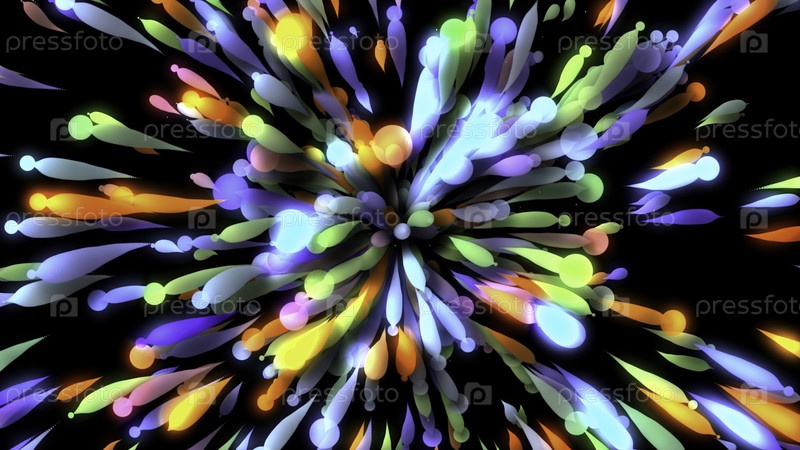 Черный фон. Движение . Ярко летящие многоцветные трехмерные линии в абстракции создают освещающие узоры и непрерывно движутся в разных направлениях