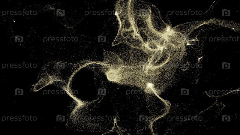 Абстрактные летающие золотые частицы на черном фоне. Дизайн. Космическая пыль в космическом пространстве, собирающаяся в одном месте