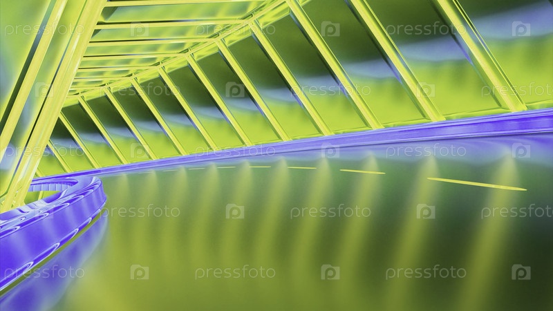 Движение по бесконечному неонному туннелю, абстрактный 3D фон. Дизайн. Сгибающийся тоннель выглядит как дорога без швов