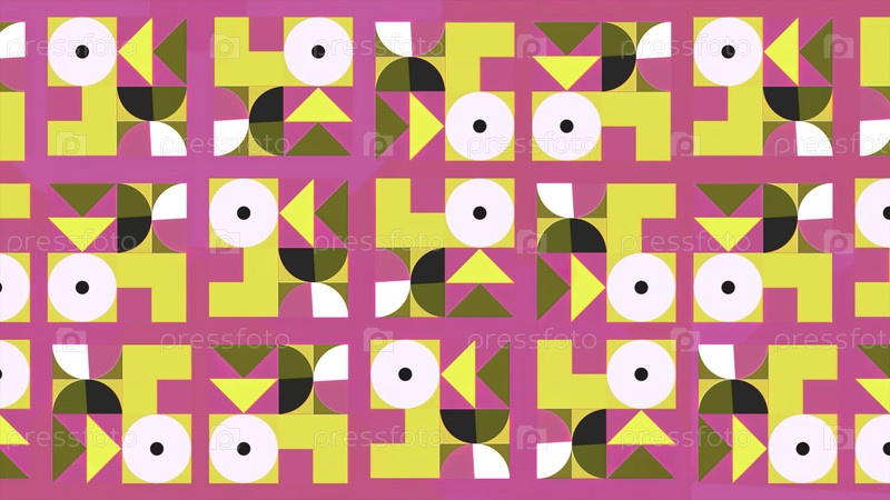 Цветный фон с движущимися геометрическими формами в стиле калейдоскопа. Движение. Яркий красочный фон с геометрическими узорами в ретро-стиле. Ретро-стиль ярких рисунков 80-х годов