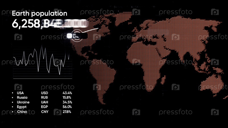 Расчет мирового населения.Движение.Черный фон с красным графиком в анимации со стремительно растущим числом.Высокое качество 4k кадров