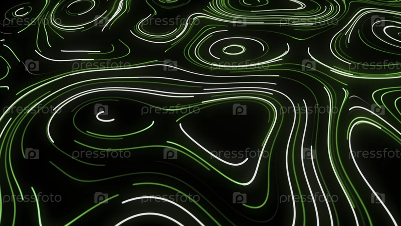 Абстракция. Движение. Толстые ярко-зеленые и фиолетовые тонкие линии появляются рядом с белыми на черном фоне