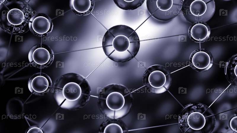 Зеленый и серый фон. Дизайн. Соединенные молекулы с ядром, которые движутся в разных направлениях в абстракции