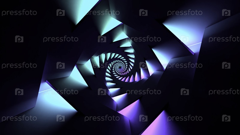 Лопильное симметричное абстрактное движение треугольников на черном фоне. Дизайн. Красочная спираль, создающая эффект туннеля, бесшовная петля