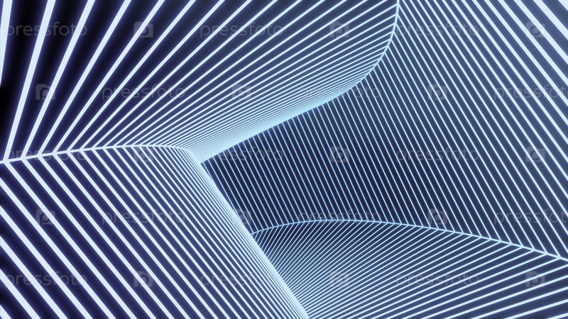 Неоновый синий яркий тоннель.Дизайн.Абстракция, которая блестит разными цветами и переворачивается на все восемьдесят градусов внутри