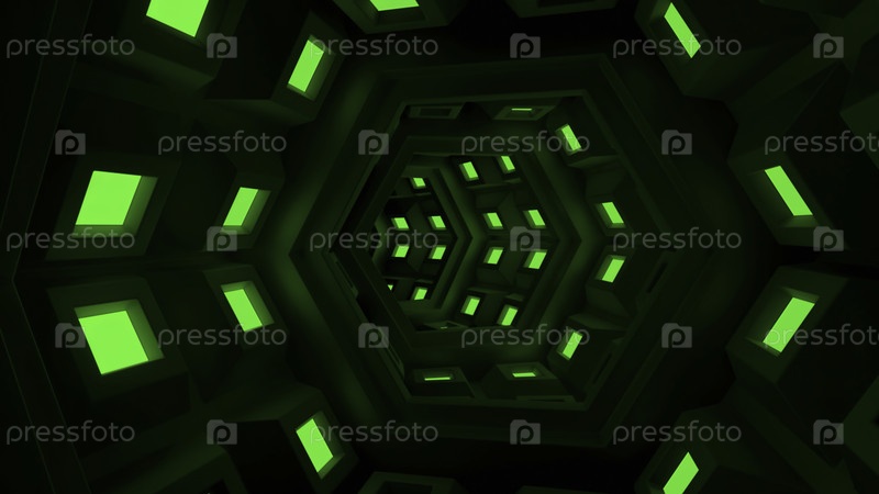 Вождение по футуристическому неонному туннелю. Дизайн. Поворачивание через футуристический тоннель с неоновыми огнями. Туннель в космическом корабле или матрице