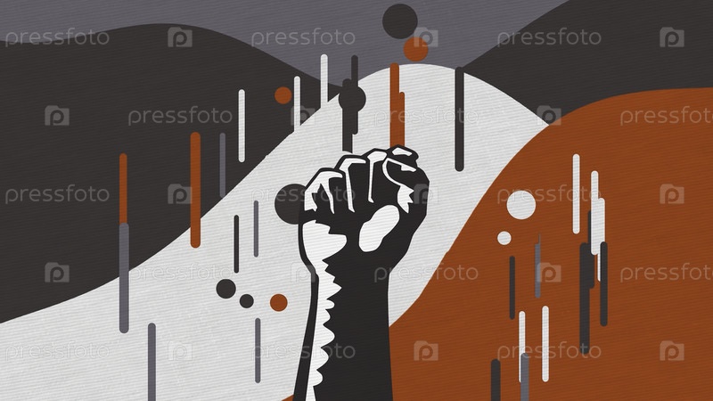 Кулак поднимается. Анимация. Мотивационный слоган для возникновения социального движения. Кулак поднимается на фоне многоцветного размахивающегося флага